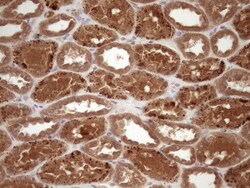 - Immunohistochemical staining of paraffin-embedded human Kidney tissue within the normal limits using anti-FSCN1 mouse monoclonal antibody. (Heat-induced epitope retrieval by Tris-EDTA, pH8.0, TA807293)(1:150)