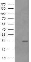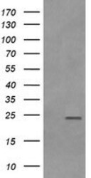- HEK293T cells were transfected with the pCMV6-ENTRY control (Left lane) or pCMV6-ENTRY RAB21 (RC210510, Right lane) cDNA for 48 hrs and lysed. Equivalent amounts of cell lysates (5 µg per lane) were separated by SDS-PAGE and immunoblotted with anti-RAB21. Positive lysates LY402398 (100 µg) and LC402398 (20 µg) can be purchased separately from OriGene.