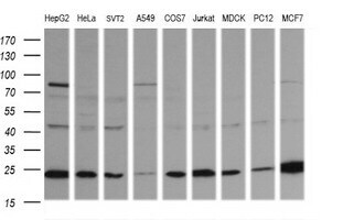 - Western blot analysis of extracts (35 µg) from 9 different cell lines by using anti-RAB21 monoclonal antibody (HepG2: human; HeLa: human; SVT2: mouse; A549: human; COS7: monkey; Jurkat: human; MDCK: canine; PC12: rat; MCF7: human).