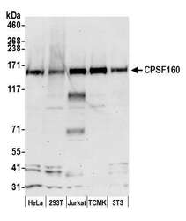 - Detection of human and mouse CPSF160 by western blot. Samples: Whole cell lysate (50 µg) from HeLa, HEK293T, Jurkat, mouse TCMK-1, and mouse NIH 3T3 cells prepared using NETN lysis buffer. Antibody: Affinity purified rabbit anti-CPSF160 antibody (Product # A301-580A; lot A301-580A-2) used for WB at 0.1 µg/mL. Detection: Chemiluminescence with an exposure time of 30 seconds.