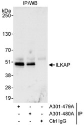 - Detection of human ILKAP by western blot of immunoprecipitates. Samples: Whole cell lysate (1 mg for IP, 20% of IP loaded) from HeLa cells. Antibodies: Affinity purified rabbit anti-ILKAP antibody A301-479A used for IP at 3 µg/mg lysate. ILKAP was also immunoprecipitated by rabbit anti-ILKAP antibody A301-480A, which recognizes a downstream epitope. For blotting immunoprecipitated ILKAP, A301-480A was used at 1 µg/ml. Detection: Chemiluminescence with an exposure time of 30 seconds.