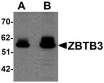 - Western blot analysis of ZBTB3 in rat brain tissue lysate with ZBTB3 antibody at (A) 1 and (B) 2 ?g/ml.