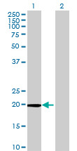 - Western Blot analysis of POLR2G expression in transfected 293T cell line (H00005436-T01) by POLR2G MaxPab polyclonal antibody.Lane 1: POLR2G transfected lysate(18.92 KDa).Lane 2: Non-transfected lysate.