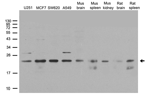 - Western blot analysis of extracts. (35ug) from different cell lines or tissues by using anti-POLR2G rabbit polyclonal antibody .