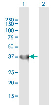 - Western Blot analysis of IDH3A expression in transfected 293T cell line (H00003419-T01) by IDH3A MaxPab polyclonal antibody.Lane 1: IDH3A transfected lysate(40.26 KDa).Lane 2: Non-transfected lysate.
