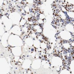 - Immunohistochemical staining of human bone marrow shows strong nuclear positivity in a subset of bone marrow poietic cells.