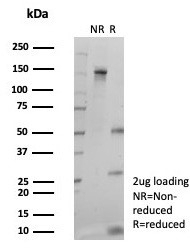 - SDS-PAGE analysis of purified, BSA-free C/EBP epsilon antibody (clone PCRP-CEBPE-1G12) as confirmation of integrity and purity.