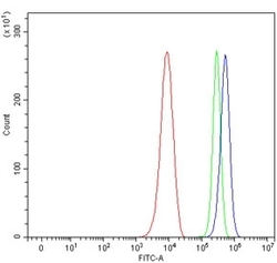 - Flow cytometry testing of mouse RAW264.7 cells with Adgrg1 antibody at 1ug/million cells (blocked with goat sera); Red=cells alone, Green=isotype control, Blue= Adgrg1 antibody.