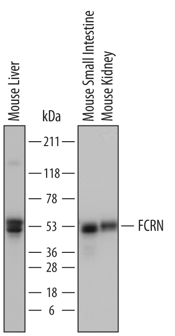 - Detection of Mouse FCRN by Western Blot. Western blot shows lysates of mouse liver tissue, mouse small intestine tissue, and mouse kidney tissue. PVDF membrane was probed with 0.25 µg/mL of Goat Anti-Mouse FCRN Antigen Affinity-purified Polyclonal Antibody (Catalog # AF6775) followed by HRP-conjugated Anti-Goat IgG Secondary Antibody (Catalog # HAF017). Specific bands were detected for FCRN at approximately 48 to 55 kDa (as indicated). This experiment was conducted under reducing conditions and using Immunoblot Buffer Group 1.