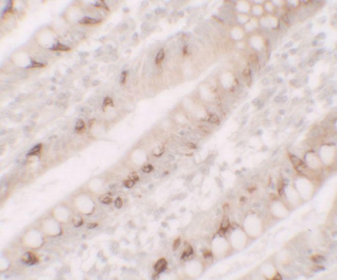 - Immunofluorescence of AGR2 in human small intestine tissue with AGR2 antibody at 20 μg/ml.