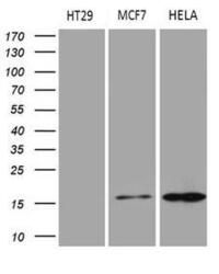 - Western blot analysis of extracts. (35ug) from 3 different cell lines by using anti-AGR2 monoclonal antibody. (1:500)