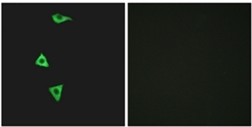 - Immunofluorescence analysis of LOVO cells, using BDKRB1 Antibody Cat.-No AP32214PU-N. The picture on the right is treated with the synthesized peptide.