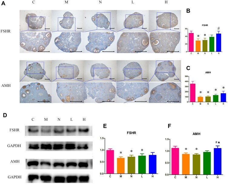 - Figure 4 Protein analysis of ovarian FSHR and AMH in different groups. ( A ) Immunohistochemistry analysis of ovary sections in different groups. ( B ) and ( C ) are quantitative analysis of the positive stained part in follicles. ( D ) Images of the Western-blot results in different groups. ( E ) and ( F ) are quantitative analysis of the blot bands. *: P