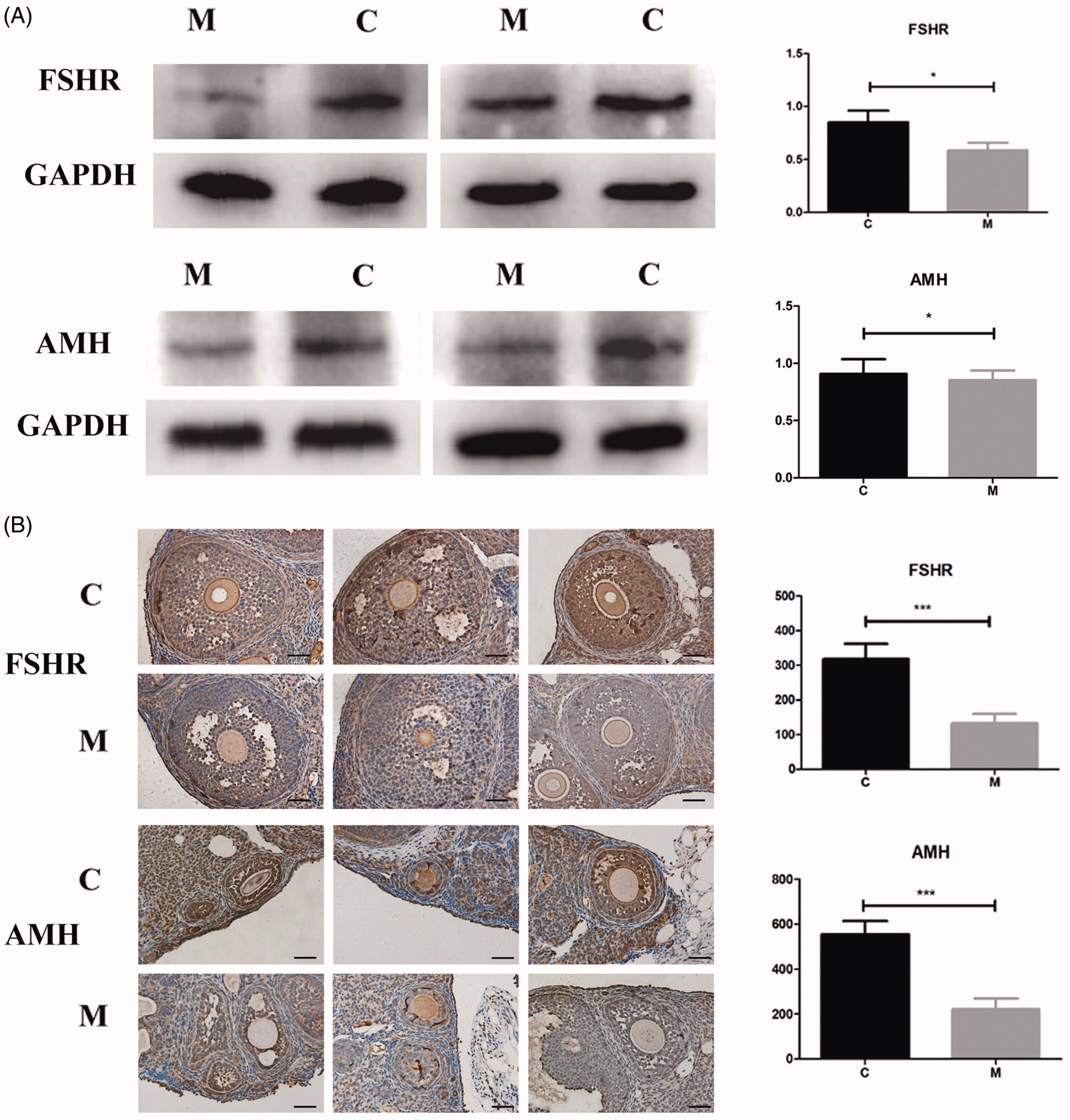 - Figure 2. Protein expression analysis of FSHR and AMH in the ovaries. (A) Western blot images of FSHR and AMH in the two groups. (B) Immunoreactivity staining results showing FSHR and AMH protein expression in antral follicles and preantral follicles. Magnification: x400. Scale bar = 12.5 mm.