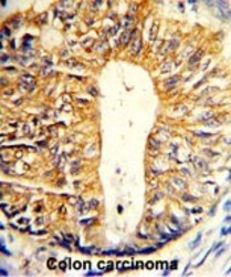 - Formalin-fixed and paraffin-embedded human colon carcinoma reacted with Villin-1 Antibody (N-term), which was peroxidase-conjugated to the secondary antibody, followed by DAB staining.
