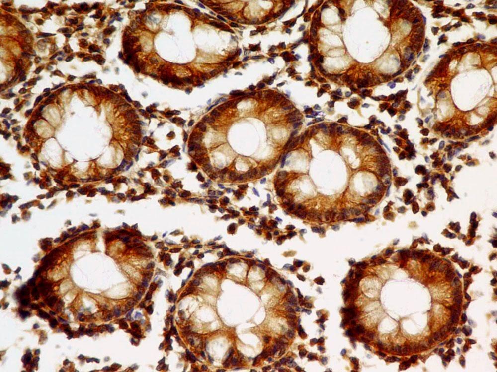- Immunohistochemical analysis of Villin in Colon Adenocarcinoma tissue using Villin antibody (Clone: ABM4E64) at 5 µg/ml.