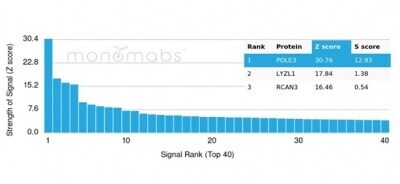 - Analysis of Protein Array containing more than 19,000 full-length human proteins using POLE3 Mouse Monoclonal Antibody (PCRP-POLE3-3D3. Z- and S- Score: The Z-score represents the strength of a signal that a monoclonal antibody (MAb) (in combination with a fluorescently-tagged anti-IgG secondary antibody) produces when binding to a particular protein on the HuProtTM array. Z-scores are described in units of standard deviations (SDs) above the mean value of all signals generated on that array. If targets on HuProtTM are arranged in descending order of the Z-score, the S-score is the diFerence (also in units of SDs) between the Z-score. S-score therefore represents the relative target specificity of a MAb to its intended target. A MAb is considered to specific to its intended target, if the MAb has an S-score of at least 2.5. For example, if a MAb binds to protein X with a Z-score of 43 and to protein Y with a Z-score of 14, then the S-score for the binding of that MAb to protein X is equal to 29.
