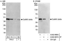 - Detection of human CaMKI delta by western blot and immunoprecipitation. Samples: Whole cell lysate from HeLa (5, 15 and 50 µg for WB; 1 mg for IP, 20% of IP loaded) and 293T (T; 50 µg) cells. Antibodies: Affinity purified rabbit anti-CaMKI delta antibody A302-667A used for WB at 0.1 µg/ml (A) and 1 µg/ml (B) and used for IP at 3 µg/mg lysate. CaMKI delta was also immunoprecipitated by rabbit anti-CaMKI delta antibody A302-666A, which recognizes an upstream epitope. Detection: Chemiluminescence with exposure times of 30 seconds (A and B).