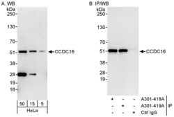 - Detection of human CCDC16 by western blot and immunoprecipitation. Samples: Whole cell lysate (5, 15 and 50 µg for WB; 1 mg for IP, 20% of IP loaded) from HeLa cells. Antibodies: Affinity purified rabbit anti-CCDC16 antibody A301-419A used for WB at 0.04 µg/ml (A) and 1 µg/ml (B) and used for IP at 3 µg/mg lysate. CCDC16 was also immunoprecipitated by rabbit anti-CCDC16 antibody A301-418A, which recognizes an upstream epitope. Detection: Chemiluminescence with exposure times of 30 seconds (A) and 10 seconds (B).