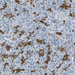 - Immunohistochemical staining of human pancreas shows strong cytoplasmic positivity in intra-lobular ducts of exocrine pancreas.