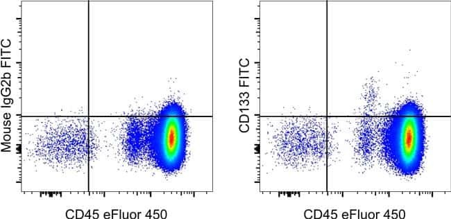 - Staining of normal human peripheral blood cells with Anti-Human CD45 eFluor® 450 (Product # 48-9459-42) and Mouse IgG2b K Isotype Control FITC (Product # 11-4732-42) (left) or Anti-Human CD133 FITC (right). Cells in the lymphocyte gate were used for analysis.