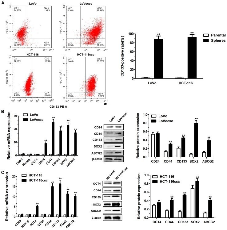 - Figure 2. Identification of colon CSCs. (A) Flow cytometry analysis and quantification of CD133 expression in spheroid cells and corresponding parental cells. Cells in Q2-2 correspond to CD133-positive cells. Results are representative images of three independent experiments. **P