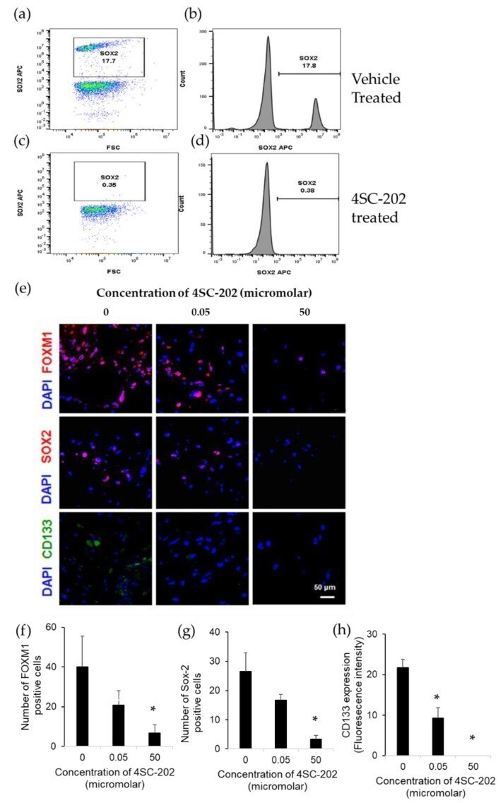 - Figure 5 4SC-202 reduces a cancer stem-like population of cells. ( a ) A SOX2 positive population of cells in vehicle-treated ATRT-06 spheroids, indicated by a small peak ( b ), nearly disappears 72 h following 4SC-202 treatment ( c , d ). ( e ) Representative fluorescent images exhibiting reduced number of cells expressing FOXM1, SOX2, and CD133 by ATRT-06 cells grown in 3D scaffolds after treatment with 4SC-202 at muM concentrations. Scale bar = 50 mum. Stem cell marker expression of ATRT-06 cells growing within 3D scaffolds indicates a significant reduction in the number of FOXM1 positive cells ( f ), SOX2 positive cells ( g ), and CD133 expression (fluorescence intensity) ( h ), (*) p < 0.05.