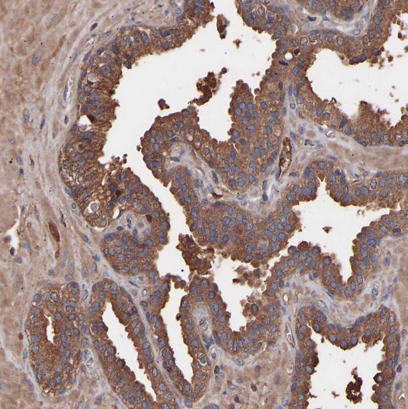 - Immunohistochemical analysis of CI091 in human prostate using CI091 Polyclonal Antibody (Product # PA5-53560) shows moderate cytoplasmic positivity in glandular cells.