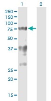 - Western Blot: Splicing Factor 1 Antibody (2E12) [H00007536-M01] - Analysis of SF1 expression in transfected 293T cell line by SF1 monoclonal antibody (M01A), clone 2E12.Lane 1: SF1 transfected lysate (Predicted MW: 59.7 KDa).Lane 2: Non-transfected lysate.