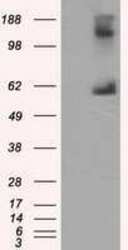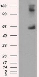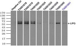 - HEK293T cells were transfected with the pCMV6-ENTRY control (Left lane) or pCMV6-ENTRY LIPG (RC209248, Right lane) cDNA for 48 hrs and lysed. Equivalent amounts of cell lysates (5 µg per lane) were separated by SDS-PAGE and immunoblotted with anti-LIPG. Positive lysates LY401821 (100 µg) and LC401821 (20 µg) can be purchased separately from OriGene.