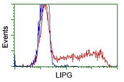 - HEK293T cells transfected with either RC209248 overexpress plasmid (Red) or empty vector control plasmid (Blue) were immunostained by anti-LIPG antibody (TA501041), and then analyzed by flow cytometry.