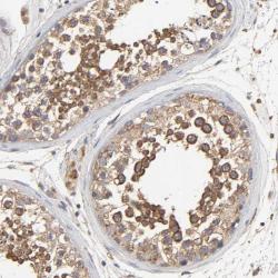- Immunohistochemical staining of human testis shows strong cytoplasmic positivity in cells in seminiferus ducts.