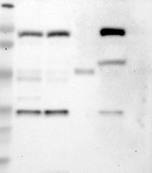 - Band of predicted size in kDa (+/-20%) with additional bands present.