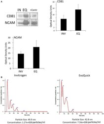 - Figure 2 EV characterization in serum from stroke patients . (A) Representative immunoblot of CD81 and NCAM positive EV isolated with the Invitrogen Kit (IN) and the ExoQuick Kit (EQ). +Contr: Positive control of isolated EV. Quantification of CD81- and NCAM-positive EV isolated from serum with the Invitrogen kit (INV) and the ExoQuick kit (EQ). Nanoparticle tracking analysis of isolated serum-derived EV. (B) Nanoparticle tracking analysis predicts size distribution and concentration of particles in serum-derived EV samples isolated with the Invitrogen kit and the ExoQuick kit.
