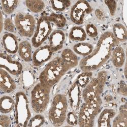 - Immunohistochemical staining of human kidney shows moderate cytoplasmic positivity in tubular cells.