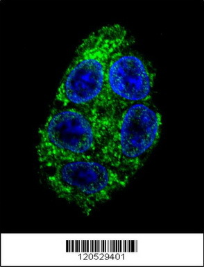 - Confocal immunofluorescent analysis of DDAH1 Antibody (C-term)(Cat#TA324755) with HepG2 cell followed by Alexa Fluor 488-conjugated goat anti-rabbit lgG (green). DAPI was used to stain the cell nuclear (blue).