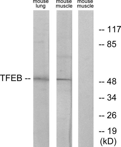 - Western blot analysis of lysates from mouse lung and mouse muscle cells, using TFEB Antibody. The lane on the right is blocked with the synthesized peptide.