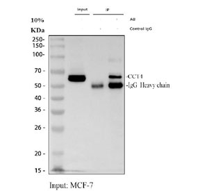 - Immunoprecipitation of TCP1 delta protein from 500ug of human MCF7 whole cell lysate with 2ug of TCP1 delta antibody.