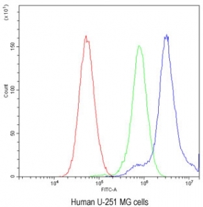 - Flow cytometry testing of human U-251 MG cells with TCP1 delta antibody at 1ug/10^6 cells (blocked with goat sera); Red=cells alone, Green=isotype control, Blue= TCP1 delta antibody.