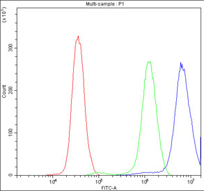 - Flow cytometry testing of fixed and permeabilized human K562 cells with TCP1 delta antibody at 1ug/million cells (blocked with goat sera); Red=cells alone, Green=isotype control, Blue= TCP1 delta antibody.