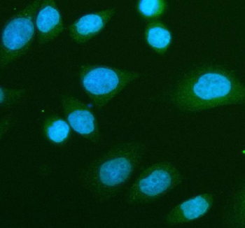 - IF/ICC staining of FFPE human SiHa cells with TCP1 delta antibody (green) and DAPI nuclear stain (blue) at 2ug/ml. HIER: steam section in pH6 citrate buffer for 20 min.
