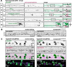 - Figure 6. The adrenergic receptor Adrb2 is expressed in cells ventral to the central canal in which norepinephrine can be detected. ( A ) Double immunodetection of GFP (left) and endogenous norepinephrine (middle) in the spinal cord of scospondin ut24Tg embryos at 30 hpf imaged laterally. Merged signals and close up of boxed regions are represented on the right. 5 representative examples (#1 to #5) out of 26 embryos are shown (no signal was detected in 6 embryos out of 26 in total, n = 2 independent experiments). In the central canal, norepinephrine positive signals can be detected as colocalized with the Reissner fiber itself (black arrowheads; embryos #1, 2, 3), with extrafibrillar material in the central canal (black arrowheads; embryos #4 and #5), and closely apposed to the massa caudalis located after the caudal limit of the central canal (black arrowhead; embryo #6). Scale bars: 10 um. r: rostral; c: caudal; d: dorsal; v: ventral; cc: central canal; fp: floor plate. ( B ) Immunohistochemistry for the adrenergic receptor Adrb2 in a 30 hpf control sibling (left, representative example out of 8 embryos) and a scospondin icm15/icm15 embryo (right, representative example out of 9 embryos). Adrb2 is distributed along the midline of the ventral most region of the neural tube (corresponding to the floor plate, fp) at the interface with the central canal (cc). Embryos are oriented rostral to the left and dorsal to the top. Scale bars: 10 um. ( C ) Sagittal views of double immuno