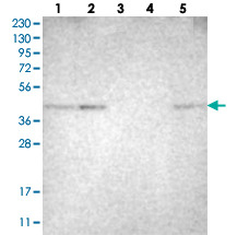 - Western blot analysis of Lane 1: RT-4, Lane 2: U-251 MG, Lane 3: Human Plasma, Lane 4: Liver, Lane 5: Tonsil with SLC30A2 polyclonal antibody (Cat # PAB20988) at 1:250-1:500 dilution.