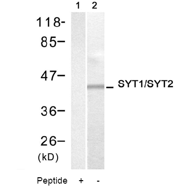 - Figure 1. Western blot analysis of extract from Hela cells using Synaptotagmin I/II Antibody (Lane 1 and 2).
