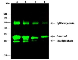 - Galectin 3 Immunoprecipitation using: Lane A: 0.5 mg MCF-7 Whole Cell Lysate, Lane B: 0.5 mg Hela Whole Cell Lysate, Lane C: 0.5 mg SW480 Whole Cell Lysate, Lane D: 0.5 mg A431 Whole Cell Lysate 2 µL with Galectin 3 Polyclonal Antibody (Product # PA5-80773) and 15 µL of 50 % Protein G agarose. Primary antibody: Galectin 3 Polyclonal Antibody, at 1:200 dilution. Secondary antibody: Dylight 800-labeled antibody to rabbit IgG (H+L), at 1:5,000 dilution. Developed using the Odyssey technique. Performed under reducing conditions. Predicted band size: 30 kDa. Observed band size: 30 kDa.