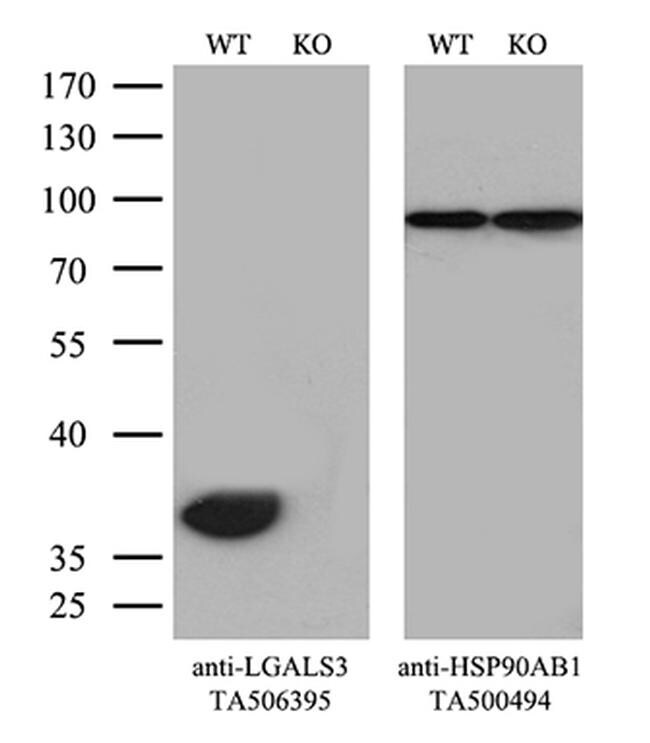- Equivalent amounts of cell lysates (10 µg per lane) of wild-type Hela cells (WT, Cat# LC810HELA) and LGALS3-Knockout Hela cells (KO, Cat# LC810128) were separated by SDS-PAGE and immunoblotted with anti-LGALS3 monoclonal antibody TA506395. Then the blotted membrane was stripped and reprobed with anti-HSP90AB1 antibody (TA500494) as a loading control. (1:500)