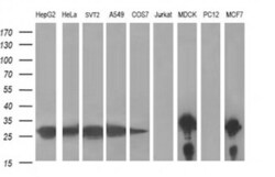 - Western blot analysis of extracts (35 µg) from 9 different cell lines by using anti-LGALS3 monoclonal antibody at 1:400 dilution (HepG2: human; HeLa: human; SVT2: mouse; A549: human; COS7: monkey; Jurkat: human; MDCK: canine; PC12: rat; MCF7: human).