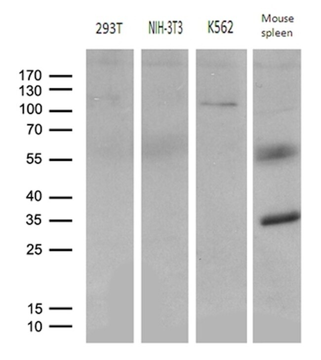 - Western blot analysis of extracts (35 µg) from 3 different cell lines and mouse spleen tissue lysate by using anti-ELF4 monoclonal antibody.(1:500)
