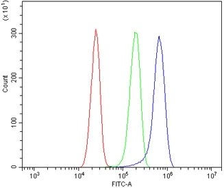 - Flow cytometry testing of human U-87 MG cells with SYNPO antibody at 1ug/million cells (blocked with goat sera); Red=cells alone, Green=isotype control, Blue= SYNPO antibody.