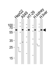 - Western blot: 35 µg of HepG2, A549, HT-29 cell line, human kidney and liver tissue lysates (from left to right) stained with ARG54726 anti-CYP3A4 antibody at 1:1000 dilution.